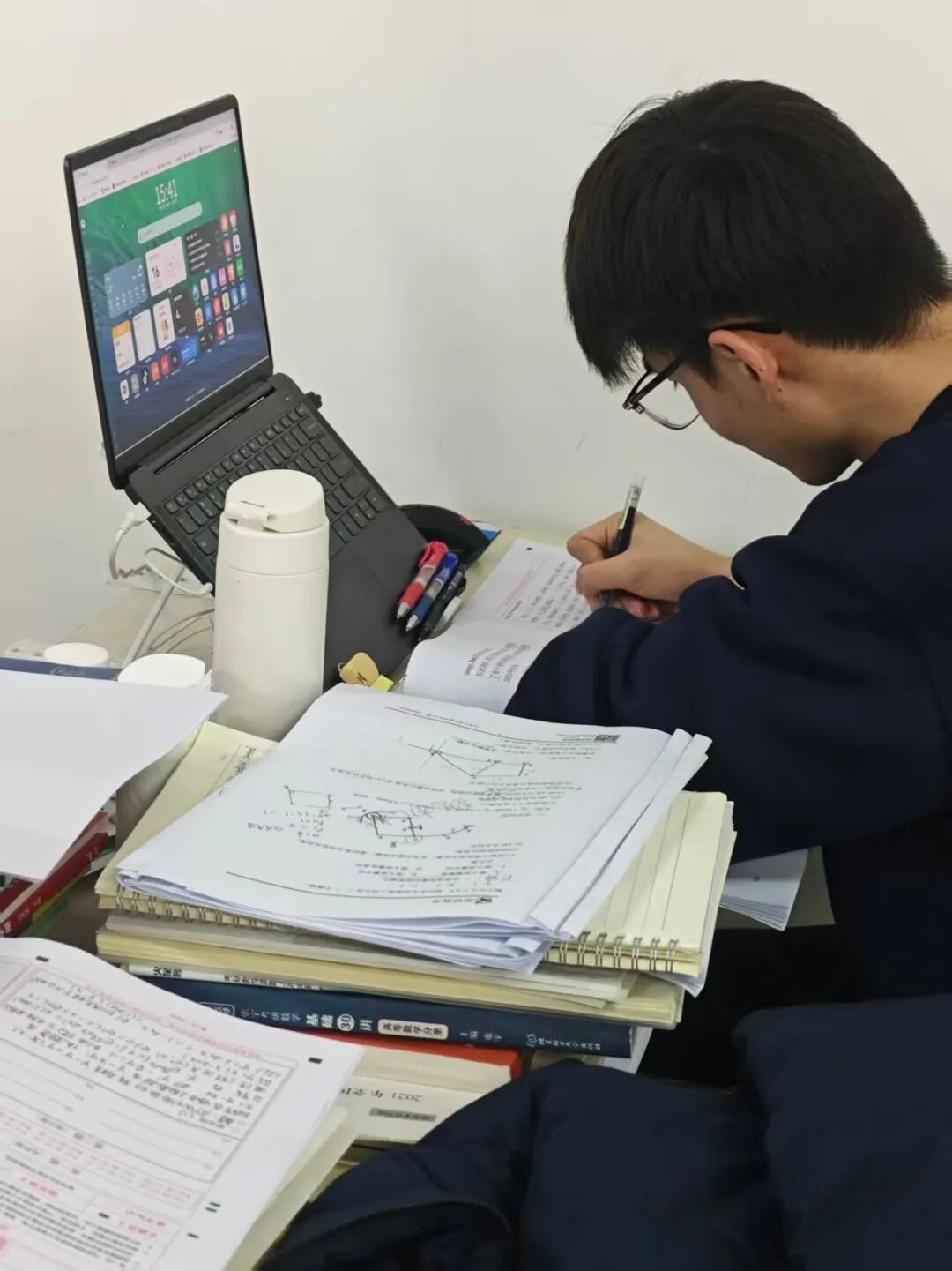 早八、实验、报告修改填满生活,备考只能挤边角时间:晨读时记政治考点,实验等待间隙析真题,等自习室清场后,再回到书桌复盘,直到深夜才卸下疲惫。