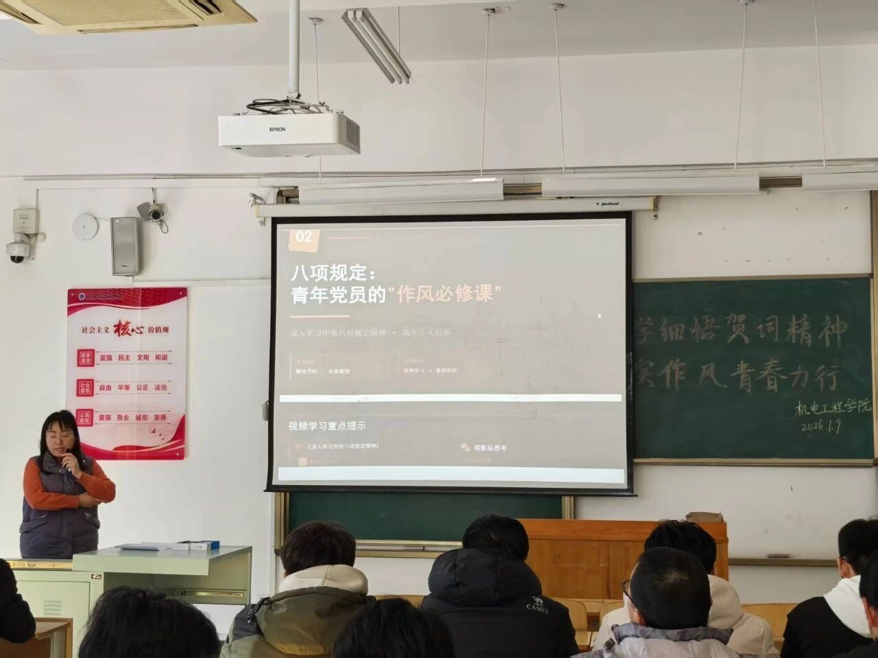 为扎实推进全面从严治党,引导青年学子深刻领会并自觉践行中央八项规定精神,1月9日下午,我院面向全体学生党员举办专题党课。本次学习由组织员武运卓老师主讲,以“深入学习贯彻中央八项规定精神,锤炼过硬作风”为主题,结合习近平总书记2026年新年贺词重要精神,开展纪律作风专题教育。