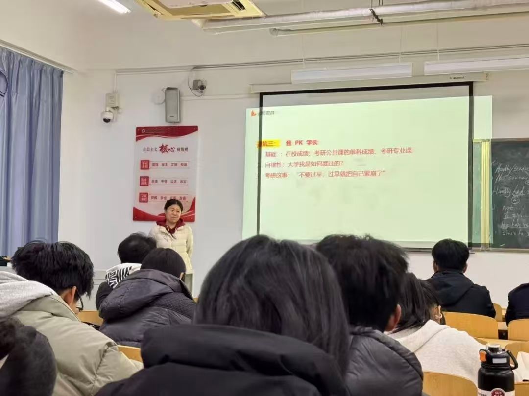 为进一步提高机电工程学院学子对考研形势的了解、增添考研热情、明确考研目标、掌握相关考研技巧和院校选择方法。机电工程学院于2025年12月4日开展了考研主题讲座,本期讲座特别邀请到河北工业大学硕士研究生桑晨老师作为嘉宾进行经验分享,帮助同学们答疑解惑。
