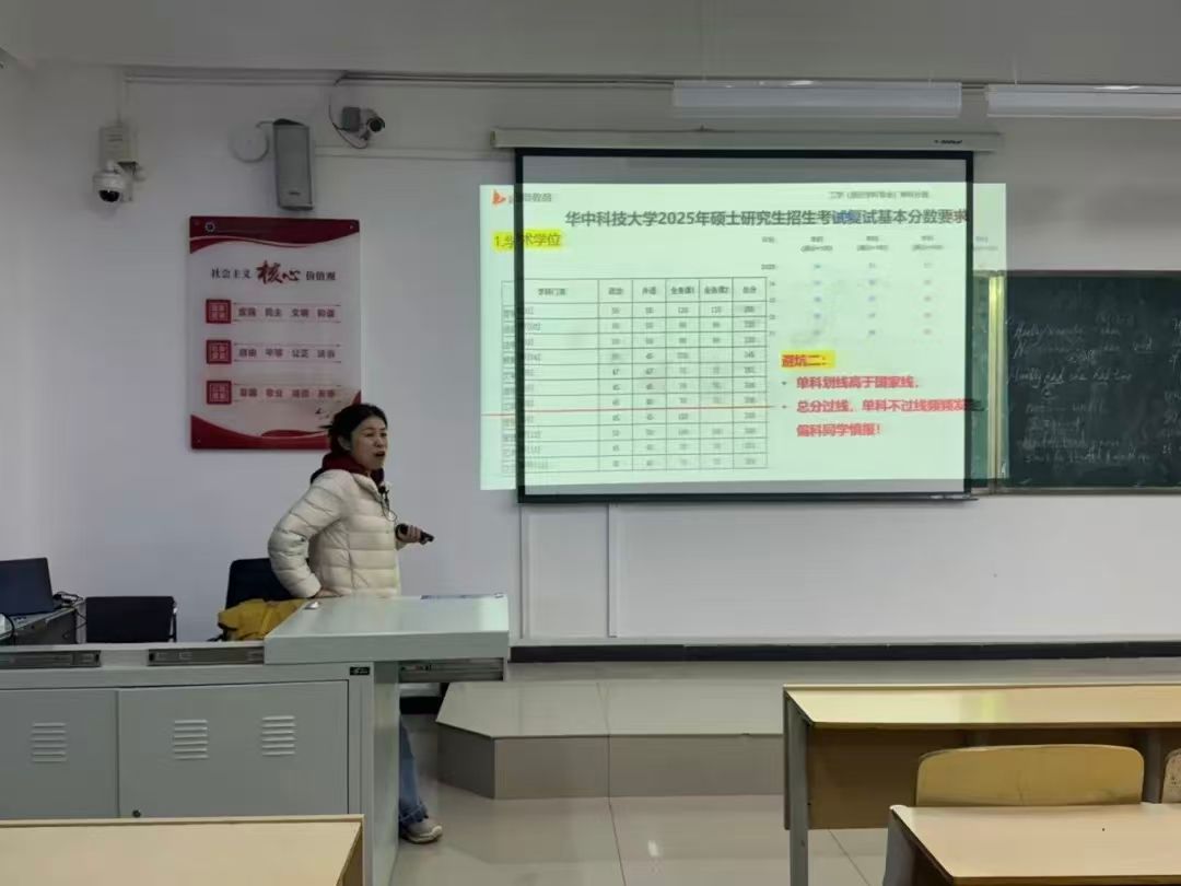 讲座伊始,桑老师凭借深厚的专业知识、丰富经验以及生动有趣的语言,为同学们深入剖析当下考研形势,详细解读了华中科技大学25年硕士研究生招生考试基本分数要求。同学们通过这些数据,直观地了解到该校考研竞争的激烈程度,也深刻认识到制定合理备考计划的必要性,这为他们后续的考研征程奠定了认知基础 。